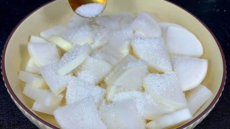 萝卜处理:将白萝卜洗净去皮,切成条状或片状,大小均匀以便入味。使用2大勺白糖进行腌制,放置约30分钟以帮助出水。腌制后,轻轻挤干水分,放在通风处稍许晾干表面水份。