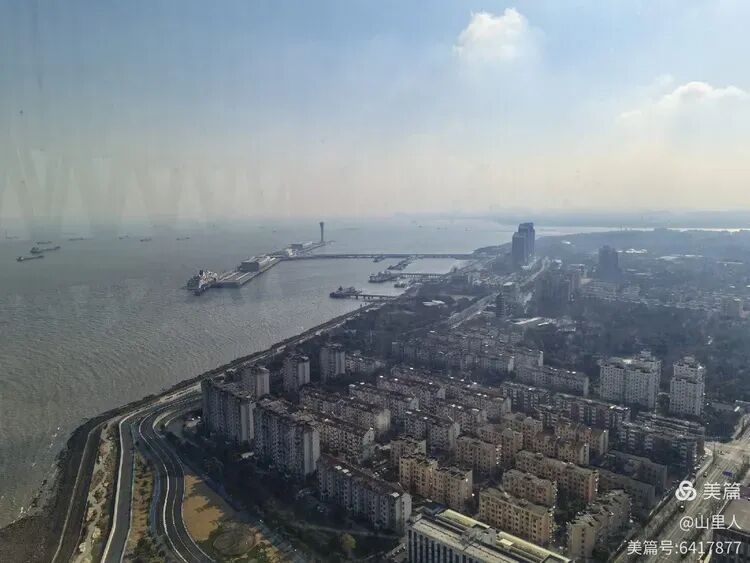 大寒之后,上海的气温在零度以下。虽然阳光绽放,海滨边的冷依旧可辨。整个360°环形玻璃墙,西面相对干净透光,所以俯瞰宝山城市一角的“干净”程度稍好。