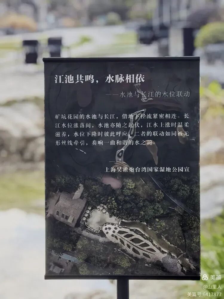 这是一个树立在坑边的标识牌。矿坑花园,应该是一尺花园矿坑店的前生;炮台湾湿地公园西北侧,应该是宝钢当初炼钢排放钢渣矿渣的所在;矿坑花园诞生的原因,极可能是宝钢环境保护措施针对矿渣山治理整顿的结果。