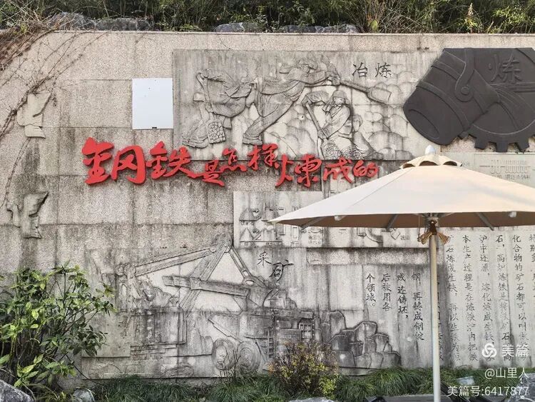 矿坑墙壁一侧,宝钢版的说文解字讲述着冶炼钢铁的流程,它是简化版的钢铁教科书。