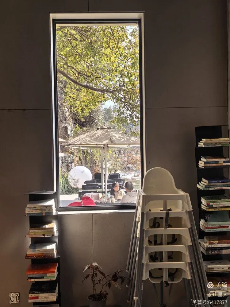 一楼营业空间一角,窗外是矿坑池畔边的遮阳棚与露天咖啡座。