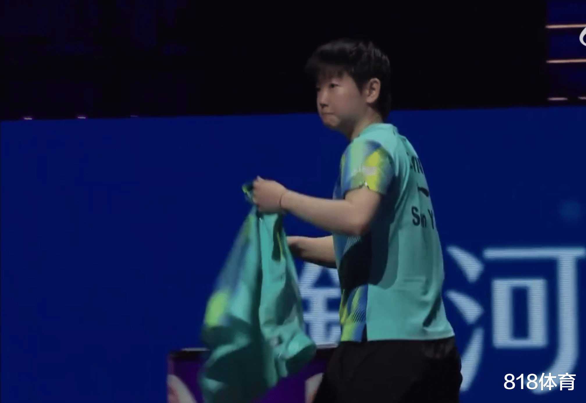 孙颖莎也很聪明,也拿起了自己的一件球衣,向裁判示意自己也需要更换一下球衣,于是,孙颖莎也去了一趟更衣室换球衣。