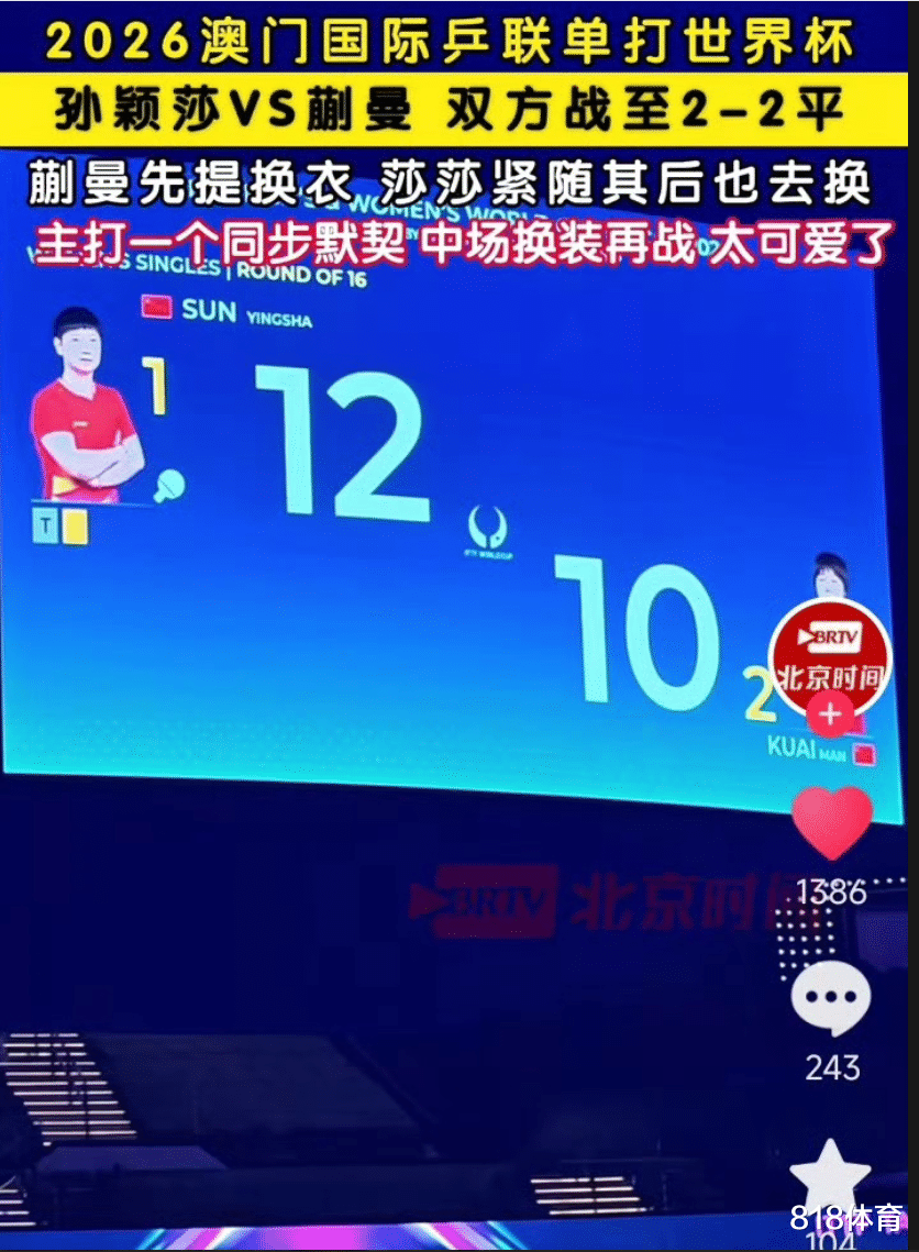 4月2日消息,4月2日晚上结束的澳门世界杯女单1/8决赛中,孙颖莎以4-2击败队友蒯曼,晋级8强。比赛第4局孙颖莎将大比分扳平后,蒯曼主动提出更换球衣,孙颖莎也很机智,也去换了球衣,回来之后连下两城淘汰对手。