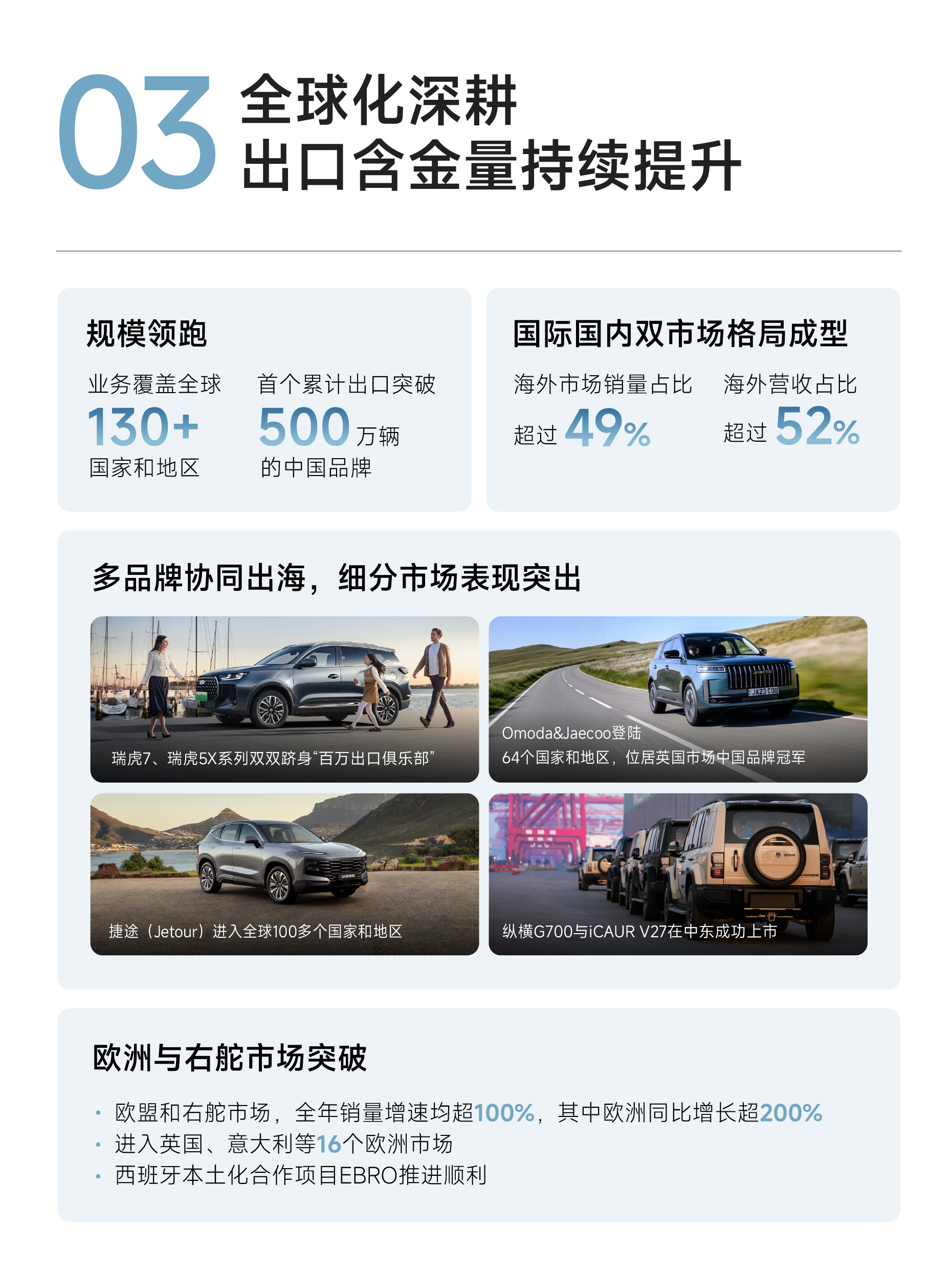 中国车企出海并非新鲜事,但奇瑞走出了一条与众不同的路。业绩公告显示,2025年奇瑞出口量达到129.44万辆,海外营收占比52.4%。更值得关注的是,奇瑞不是简单地做“倒爷”,把车卖到欠发达地区,而是深耕重点市场,建立本地化的研发、生产和销售体系。2025年,奇瑞在欧洲的研发中心正式投入运营,专门针对欧洲用户的需求进行适应性开发。这种“融入当地、扎根当地”的全球化策略,让奇瑞的出海含金量远超同行。业绩公告显示,在欧洲市场的单车售价已经与当地主流品牌持平,这意味着奇瑞不仅卖出了量,更卖出了价。当一些车企还在为出口数量沾沾自喜时,奇瑞已经实现了从“走出去”到“走上去”的跨越。