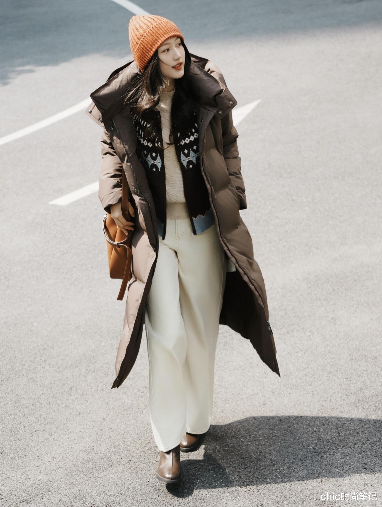 如果选择长款的羽绒服,那么内搭可以出彩一点。比如棕色羽绒服搭配棕色和米白色的内搭,深浅不一的色系,层次感和细节感都有了。