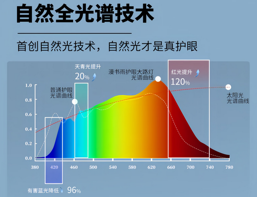 漫书雨星光Pro主打高性价比,以千元级价位实现旗舰级参数,是普通家庭闭眼入的优选。它采用原装进口普瑞灯珠,桌面平均照度高达1600lux,空间平均照度≥500lux,光照充足且均匀,减少书写阴影,覆盖大书桌与儿童学习区毫无压力。核心亮点是全光谱自然光技术,光谱拟合度超95%,显色指数Ra>98、R9≥98,接近满分显色,对色彩还原度要求高的绘本、手工、画画场景非常友好。护眼配置拉满:RG0豁免级蓝光,有害蓝光含量仅为标准限值的4%;采用数字调光实现真正0频闪,从根源杜绝视觉疲劳;搭配多重柔光结构与菱晶格栅,UGR<12,直视不刺 眼。还额外增加益眼红光与天青光波段,帮助放松睫状肌,55000小时超长寿命,耐用又省心,性价比在同价位中几乎无对手。