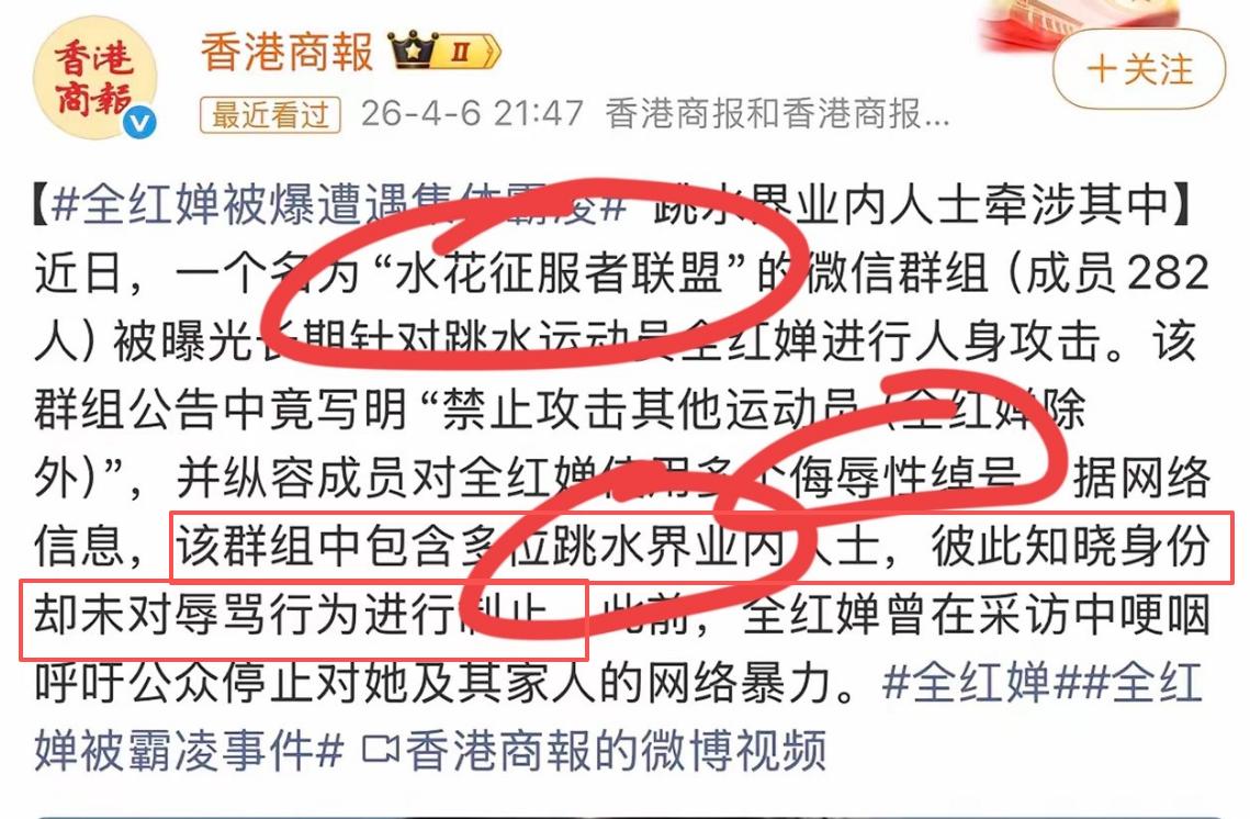 随着事情的不断发酵,霸凌群的成员信息逐渐曝光,据悉,这些专业人士里,有的是现役运动员,有的是跳水裁判,还有体育记者,甚至这里面还有全红婵在广东省队的两位队友陈艺文、昌雅妮。