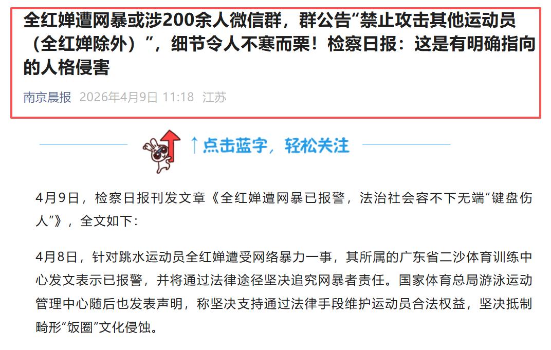 2026年4月8日,广东省二沙体育训练中心发布声明,正式确认全红婵长期遭受网络暴力,承受了不应有的精神伤害,已向公安机关报案,坚决通过法律途径追究网暴者的责任。