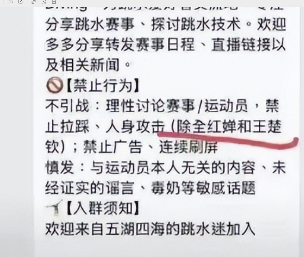 2022年,一个名为“水花征服者联盟”的微信群建立,282名成员将全红婵锁定为唯一攻击目标,群规更是双标到极致:禁止攻击其他运动员,全红婵除外。