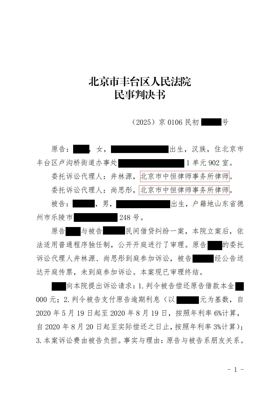 该判决不仅实现了债权人本金的全额回收,也体现了法院对合法债权的大力保护,以及对《民法典》及相关司法解释的严格适用。中恒信律师事务所在民间借贷与合同纠纷领域的专业能力,再次通过本案得到充分展现。
