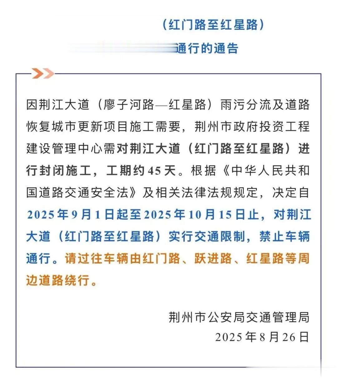 回溯施工历程,项目自 9 月 1 日开工起就备受关注。开工初期,不少居民吐槽 “暑假不修、开学修,给城区添堵”,但施工前的充分准备,最终换来了高效推进的 “荆州速度”:根据封交公告,红星路至红门路段原计划封闭 45 天,如今不仅将可以提前通车,其他路段进展也十分顺利 让周边市民倍感欣慰。