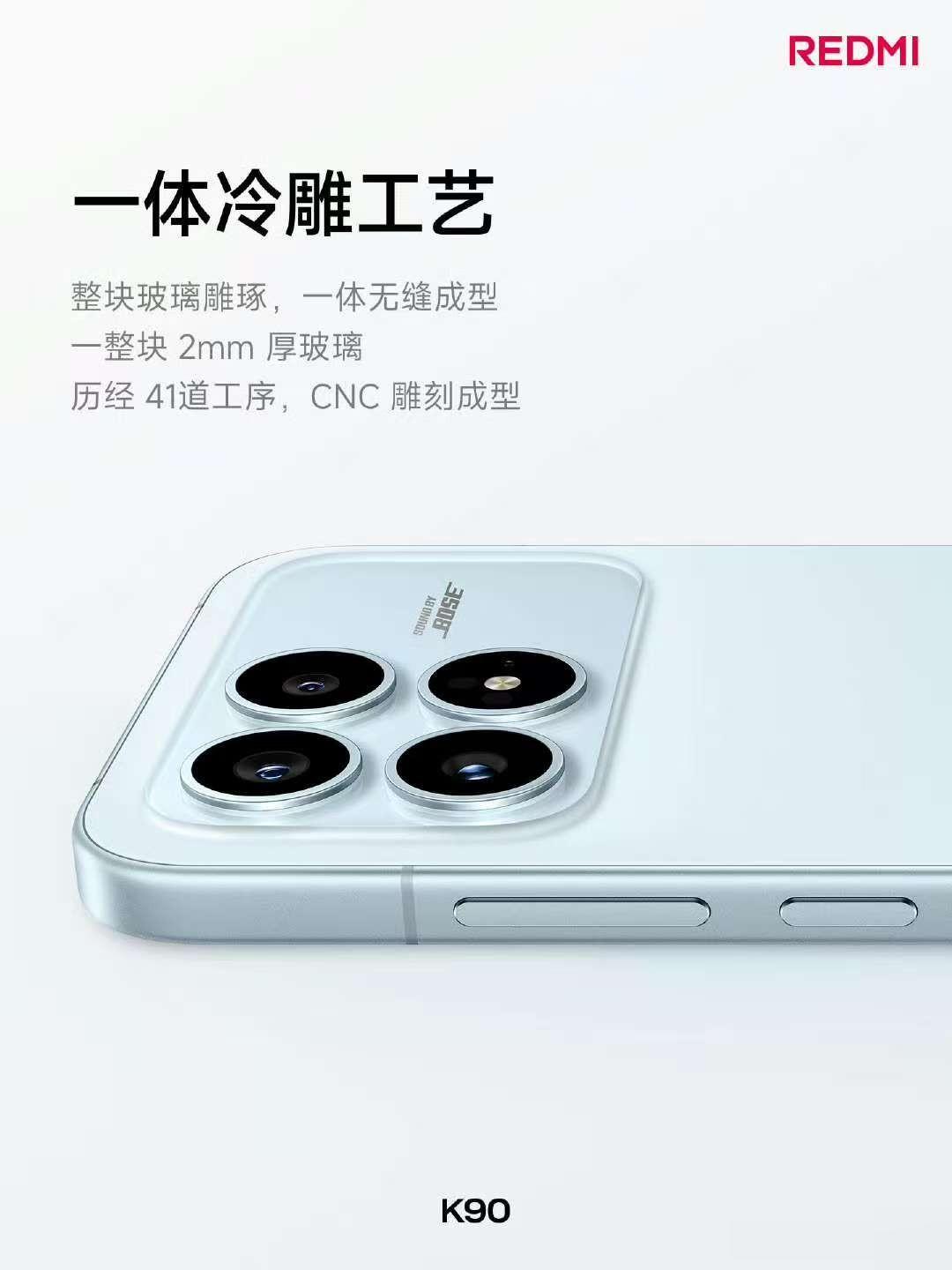 另外必须提一嘴,K90标准版这次采用了iPhone同款的一体冷雕工艺,整个机身背部是一整块玻璃雕刻成型的(参考iPhone17标准版),镜头模组的玻璃和机身玻璃是一整块加工出来的,这一点确实下了本。
