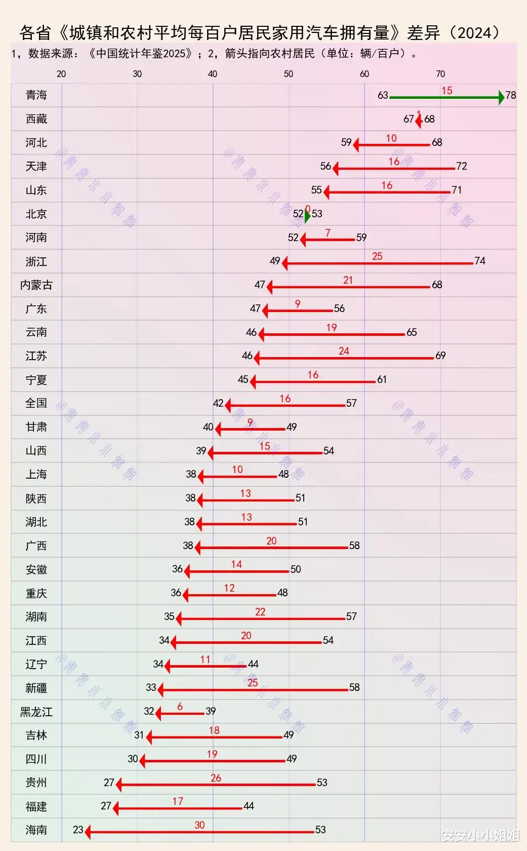 当我们把目光从青海移向全国其他地区,差异便清晰浮现。全国层面,城镇居民每百户汽车拥有量为42辆,农村为57辆,二者相差15辆。