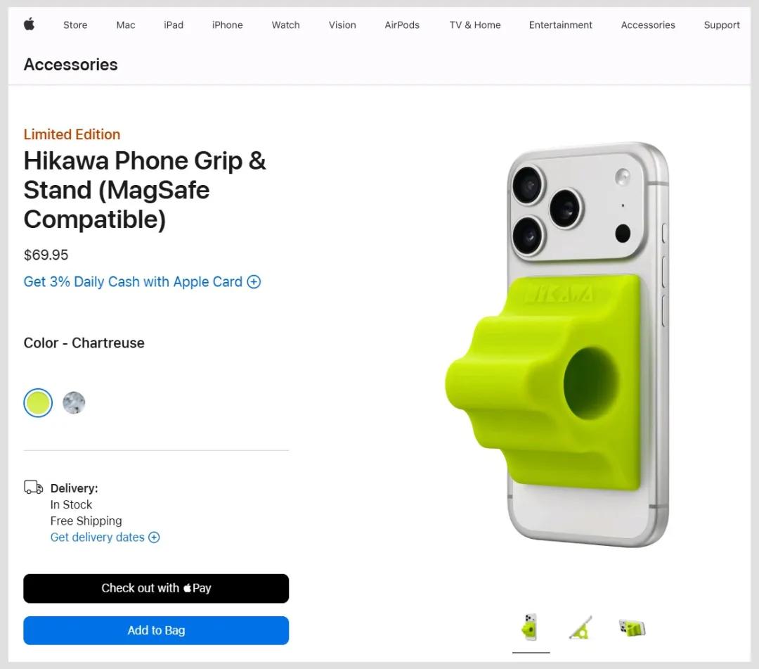 继与三宅一生联合推出收纳配件iPhone Pocket之后,苹果又一联名款新品来了。近日,苹果与洛杉矶艺术家Bailey Hikawa达成合作,推出了一款“手机握把兼支架”的新配件。