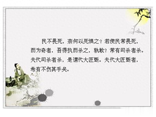 对于此句,许渊冲译成“The people do not fear death. Why threaten them with it?”,把一句话翻译成两个并列的简单句,没有连接词,没有揭示出两句间的逻辑关系。Arthur Waley译成“The people are not frightened of death. What then is the use of trying to intimidate(威吓)them with the death-penalty(刑罚)?”,句子稍长,用词稍难。辜正坤译成“When the people are not afraid of death, what is the point of threatening them with death?”,句子也稍长。可以看出,两位译者对“奈何以死惧之”的翻译,用了类似的句子“What then is the use of…?”和“what is the point of…?”,汉语意思是“…用处是什么呢?”。此外,三位译者对于“畏”、“惧”的翻译也不尽相同。我们则集众家之长,译成“Now that people are not afraid of death, why scare them with it? ”,更易于理解。