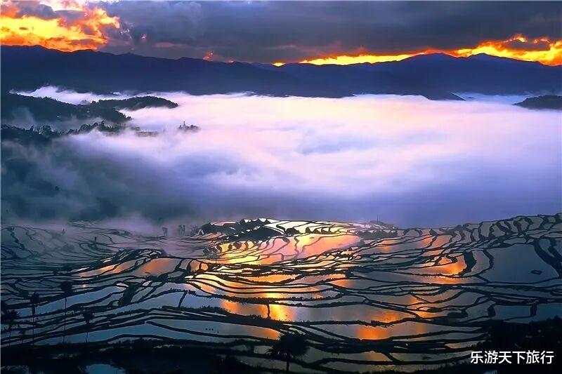 每年 11 月至次年 4 月是元阳梯田的灌水期,层层梯田如镜面般倒映着天空,日出日落时分,霞光洒在水面上,呈现出五彩斑斓的色彩,美轮美奂。