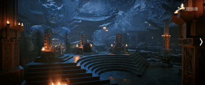 当然,服化道景的存在不仅仅是表层视觉符号,更值得品味的是意象功能。比如剧集前期,大家长常常坐在一处巨型日晷之下,随着日晷转动,时而是微光斜照面部刻出幽暗情绪,时而或是他的身影被阴影完全湮没,一方面暗示他当下处境的莫测与行为的深意,也同时在他的命运终局隐喻着人生被暗河的黑暗权力所吞噬。又如提魂殿中,三官端坐重重高阶之上,但在他们身后更有一尊巨大的神像阴暗睥睨,指向这个杀手组织的层层压制与谜团重重。