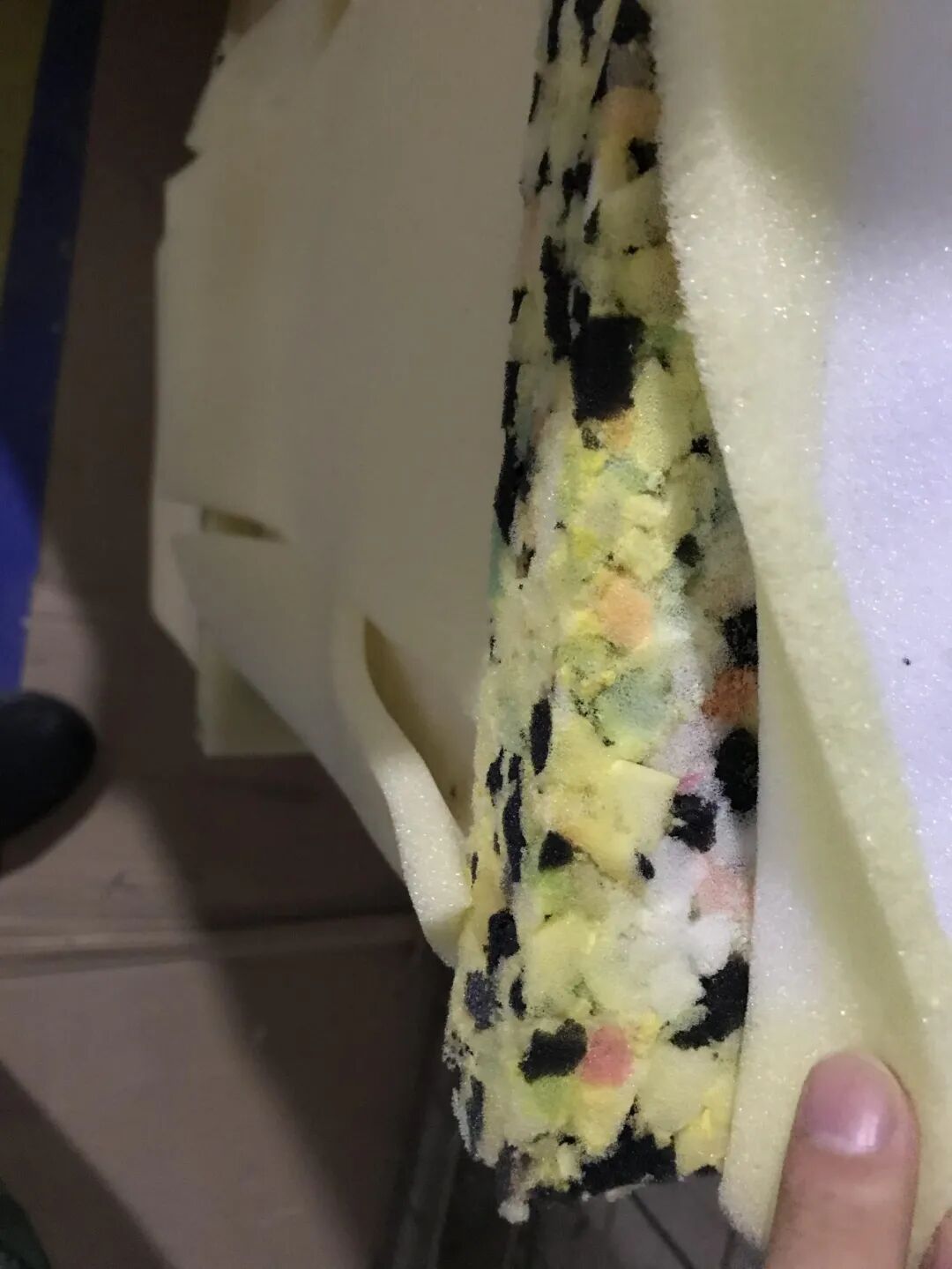 这东西,是把各种回收的聚氨酯类工业下脚料,经过粉碎、搅拌,再用大量胶水压缩成型的。拆开看,那画面简直令人作呕。
