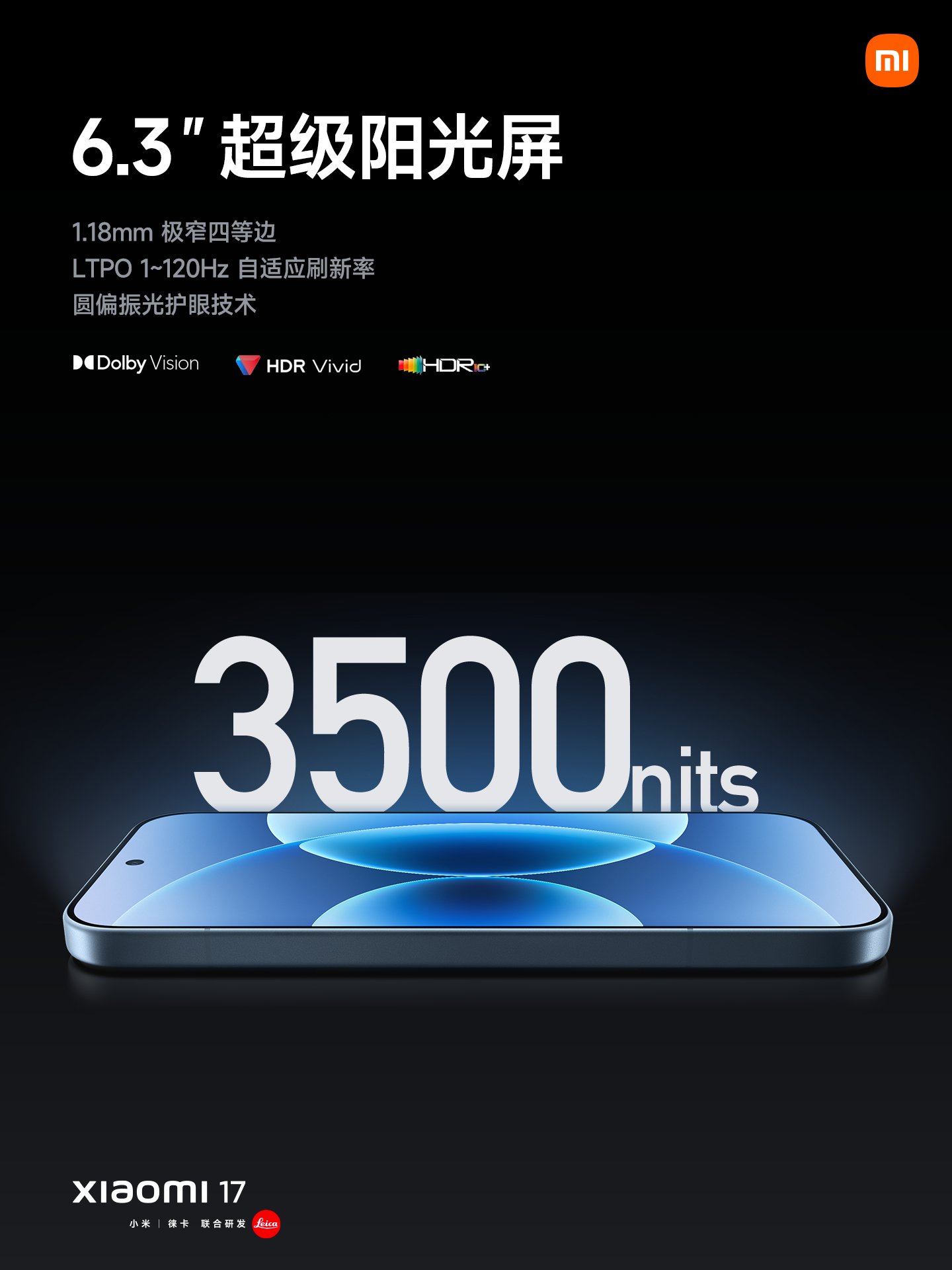 小米17的6.3英寸超级阳光屏带来了视觉上的全面升级。它采用了全新的小米M10屏幕发光体系,并首次搭载国产“新型红色发光主材”,发光效率首次实现国际领先。屏幕峰值亮度高达3500nits,即使在户外强光下也能清晰可见,同时功耗更低,为长续航提供了有力保障。