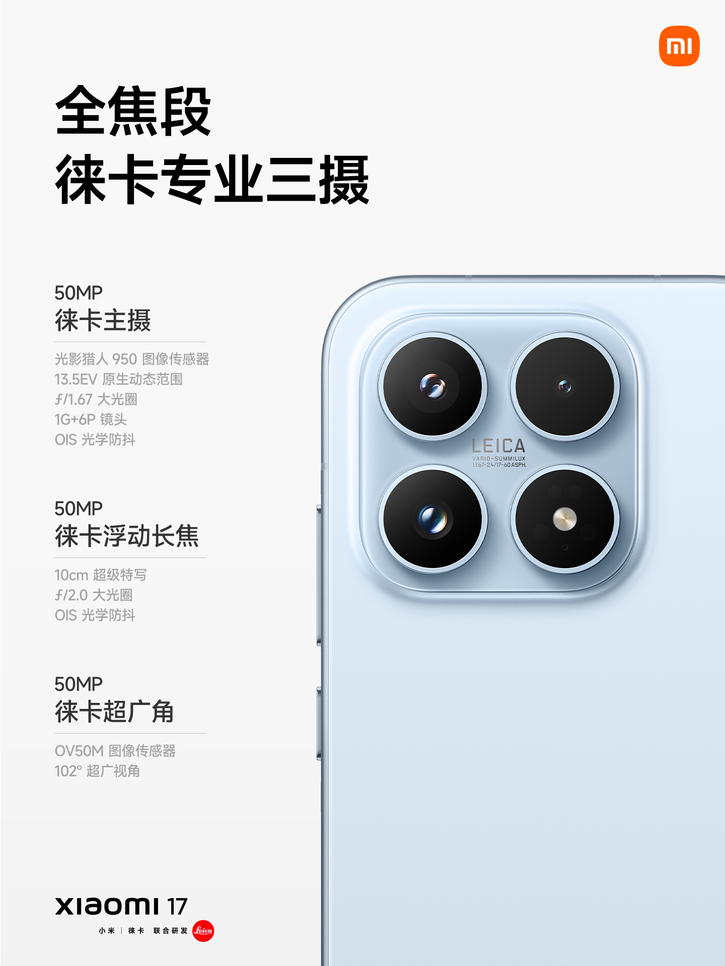 综合实力除了上述亮点,小米17还配备了徕卡光学专业三摄,带来顶级的影像体验。它的出现,不仅是一款手机的发布,更是小米在小尺寸旗舰领域的又一次突破。小米17以其精致的手感、极致的性能、超长的续航和顶级的屏幕,全面展现了小米在技术研发上的深厚实力。