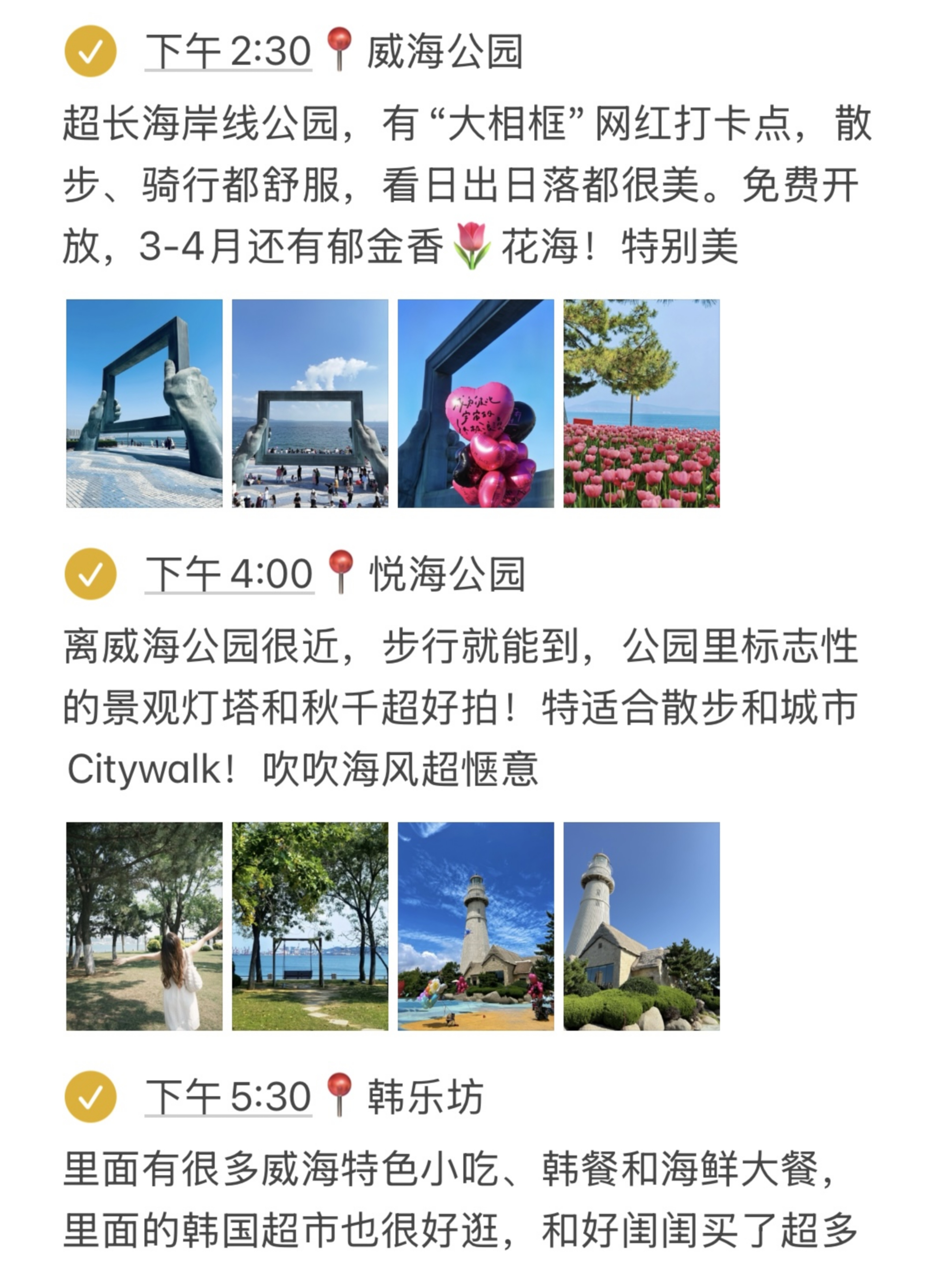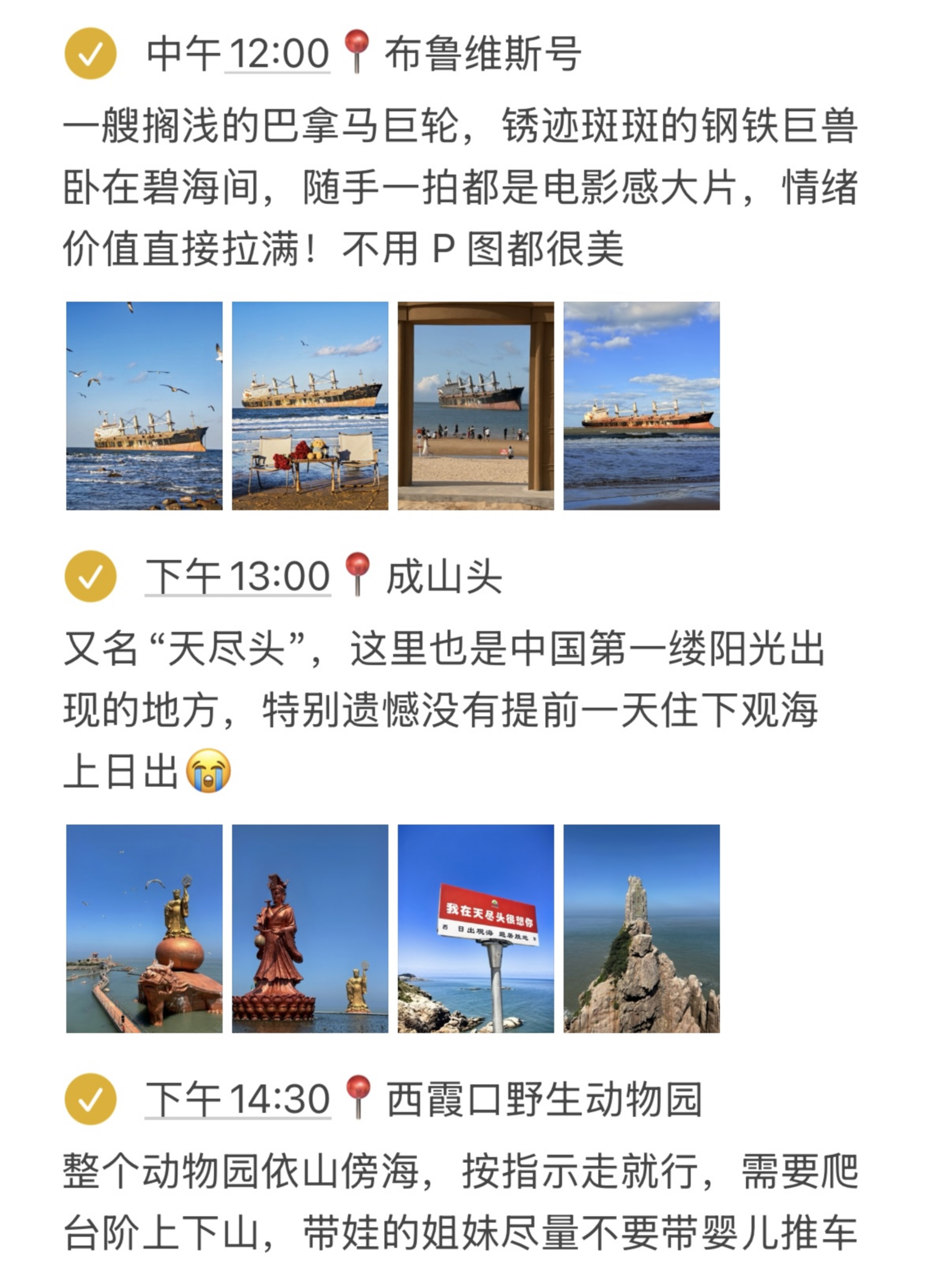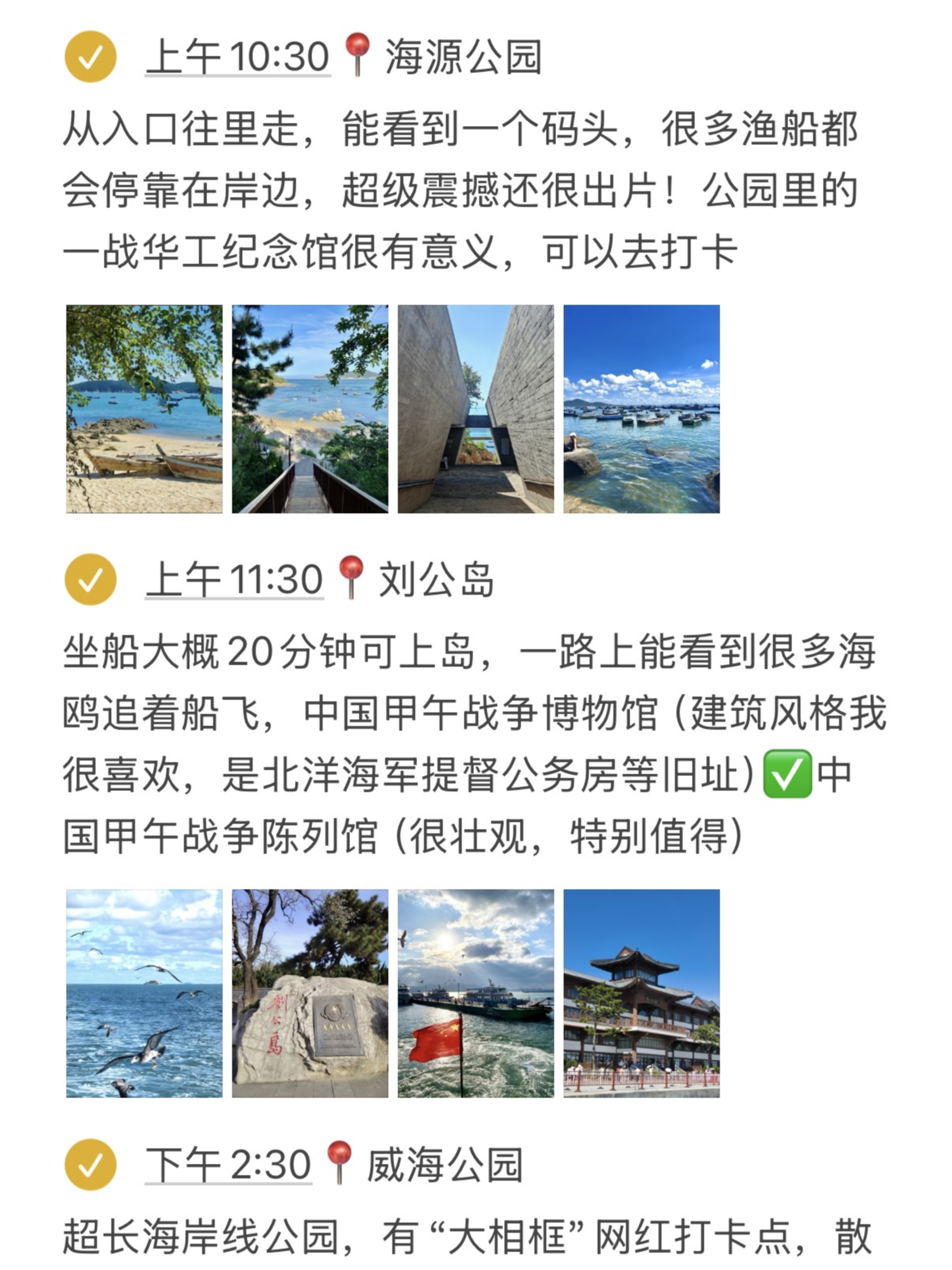 DAY2️⃣:猫头山-海源公园-刘公岛-威海公园-悦海公园-韩乐坊DAY3️⃣:那香海-鸡鸣岛-布鲁维斯号-成山头-西霞口神雕山野生动物园-✅威海美食