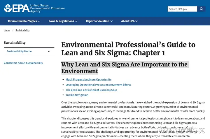 如果把视角再拉高一点,就会发现精益与六西格玛不仅影响交期、成本和客户满意度,也深刻影响资源使用、污染预防、能源消耗、材料浪费、返工报废,甚至影响企业能否在可持续发展时代保持竞争力。也正因为如此,美国环保署(EPA)在其面向环境专业人士的指南中,专门讨论了一个关键问题:为什么精益和六西格玛对环境很重要。