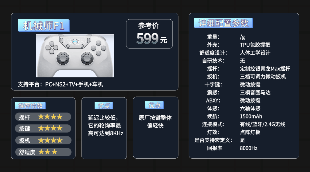 功能层面也比较“堆料”,支持三模连接,兼容手机、PC与Switch,六轴陀螺仪体感瞄准、非对称震动、宏编程按键以及KeyLinker软件调节,都能满足进阶玩家折腾需求。摇杆帽还能切换高低规格,更适合赛车、飞行类需要细腻微操的场景。不过RGB灯效亮度偏高,长时间夜间游玩有时会有点分神;而宏键放在底部虽然保持了正面观感,但盲操作需要一点熟悉时间。