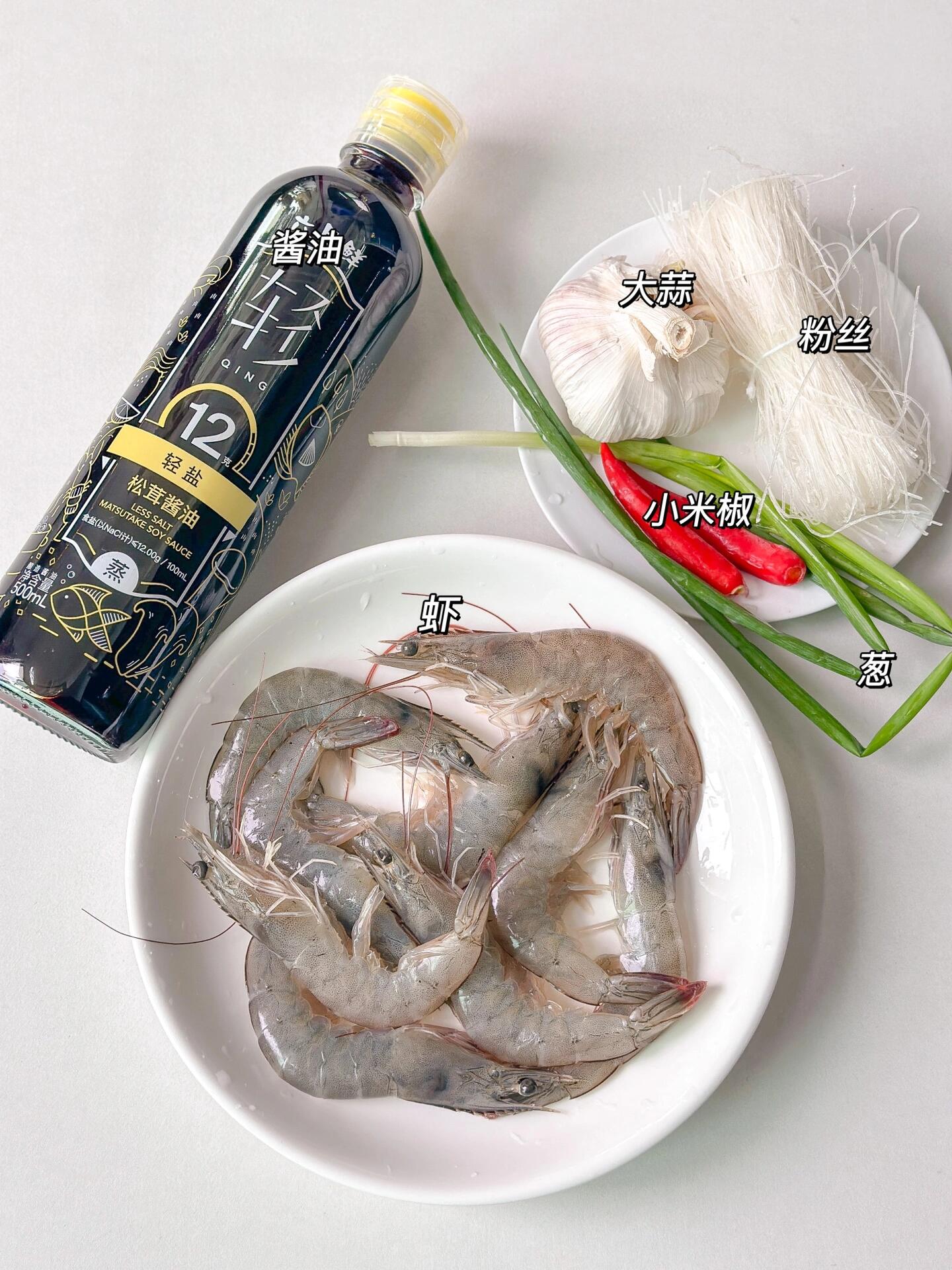 做这道菜,食材很简单:鲜活的虾9只,粉丝一捆,大蒜一头,小米椒两条,还有葱和酱油。别看食材不多,但每一样都是精髓,缺一不可。