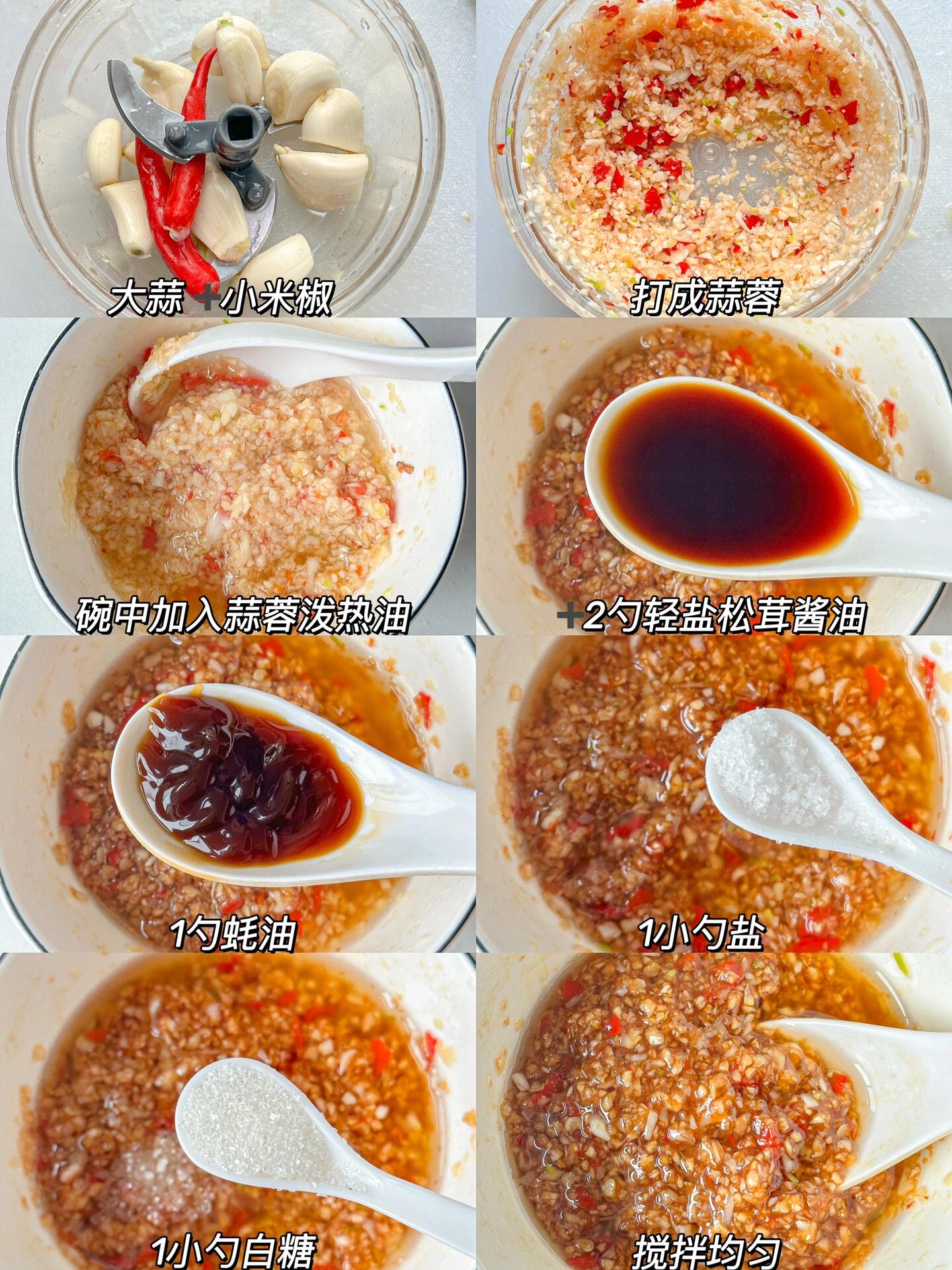 然后,就是调制酱汁了。大蒜和小米椒打成蒜蓉,这可是这道菜的灵魂所在。接着,在碗里加入蒜蓉,泼上热油,那呲啦一声,蒜香四溢,让人垂涎欲滴。再加入两勺生抽、一勺蚝油、一小勺盐和一小勺白糖,搅拌均匀。这酱汁,咸香中带着一丝丝甜意,完美地衬托出虾的鲜美。
