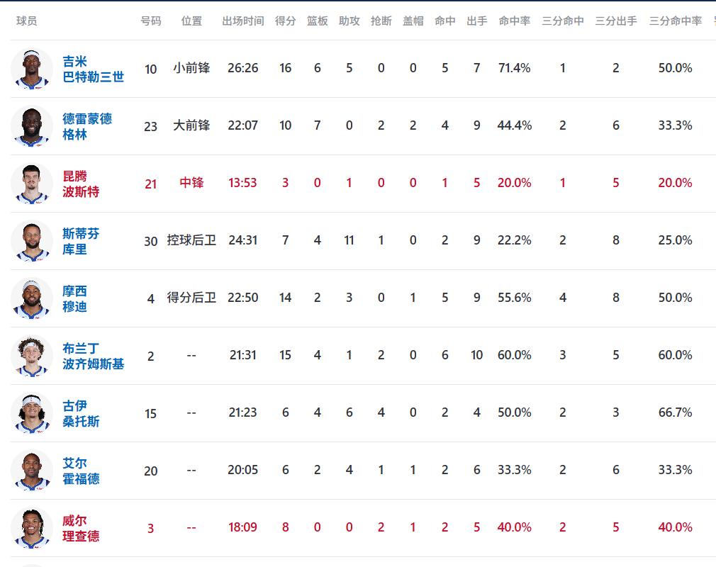 本场比赛因开拓者主力缺阵,勇士复仇悬念大幅降低。首节伊始,勇士便开启全员开花模式,持续扩大比分优势,上半场结束时已建立26分的巨大领先,胜利天平早早向主队倾斜。