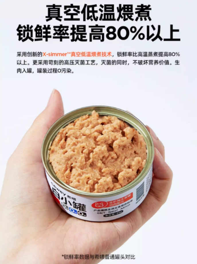 希喂采用的是X-simmer™真空低温煨煮工艺,精准控温让肉里的营养和汁水都留住,最终制成慕斯质地的猫罐头,不需要胶质物增稠,不需要诱食剂提高初食率,锁鲜率提高80%以上,猫咪被罐头的鲜香细腻给吸引,大口炫肉同时补足营养,体重自然也跟着涨,这钱花了见效了,才是真正的高性价比。