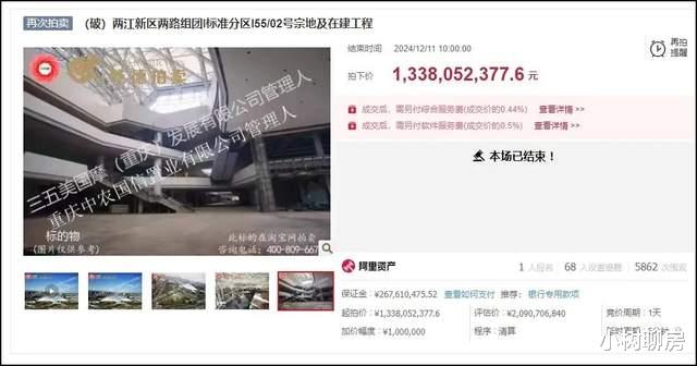 随后项目整体陷入停摆,这个修了一半的商业也被端出来拍卖,最终以13.38亿的总价被重庆保税港绿创投资发展有限公司接手,相对于评估价打了6.4折。