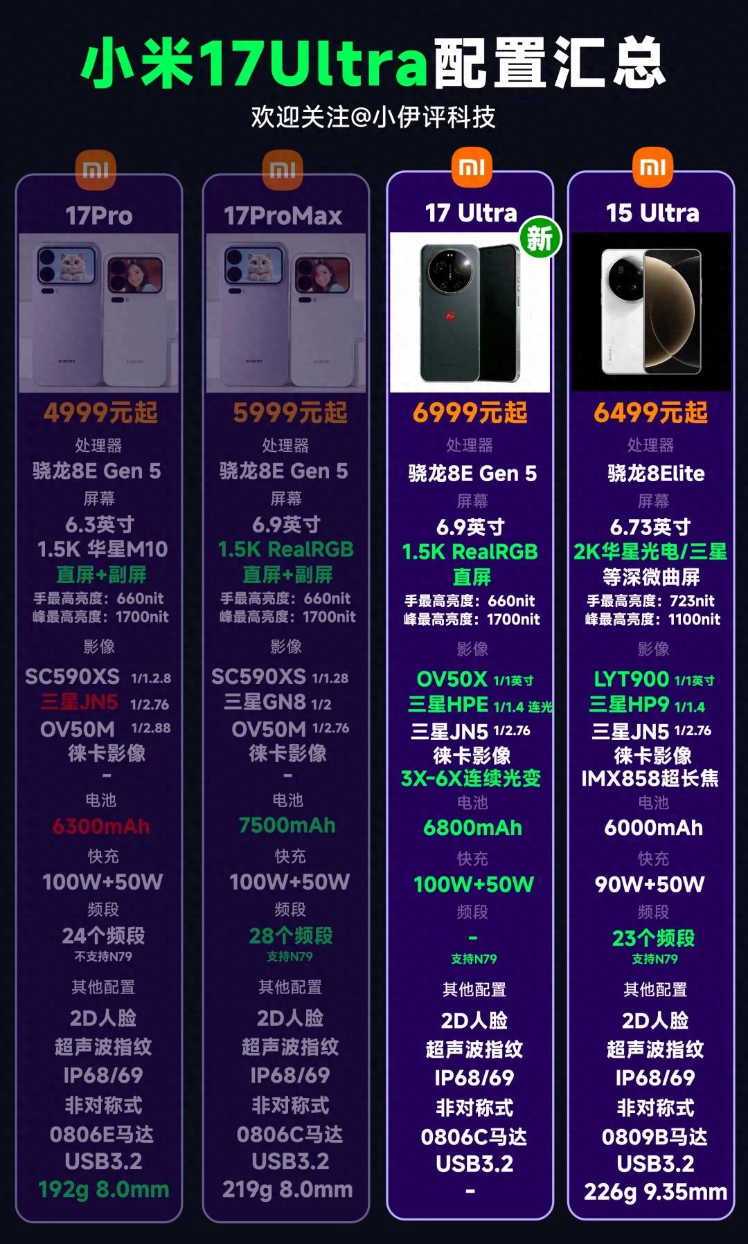 这个大家应该都看到了,我呢也就给大家汇总一下目前已知的关于小米17Ultra的配置信息,一图流如下所示:(对比小米17Pro系列以及小米15Ultra)