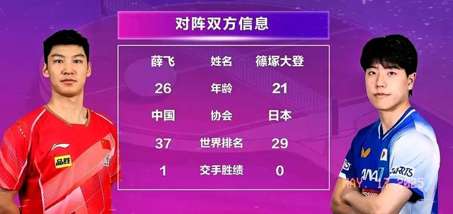 比赛开始,薛飞凭借稳定的技术和对局面的掌控,以11:9先声夺人。第二局,筱冢调整战术,凭借精确的反手和凌厉的进攻以11:9扳回一局。第三局,尽管薛飞追赶至11平,筱冢凭借关键球的稳定发挥以13:11拿下,逆转领先。接下来的两局,薛飞失误增多,连续两局以14:16和12:14失利。最后一局,薛飞未能调整心态,最终以4:11输掉决胜局,筱冢大登完成了4:2的逆袭。