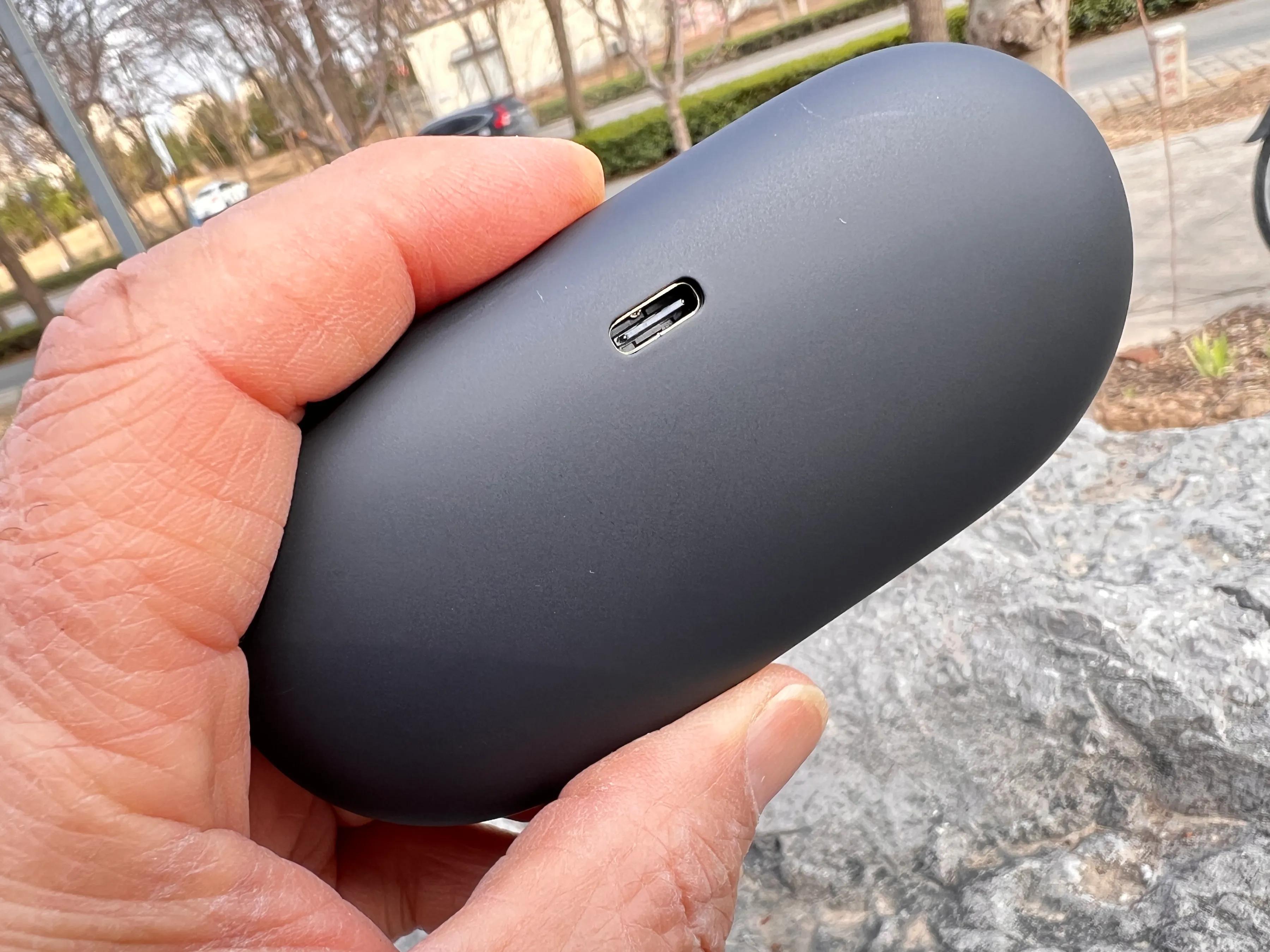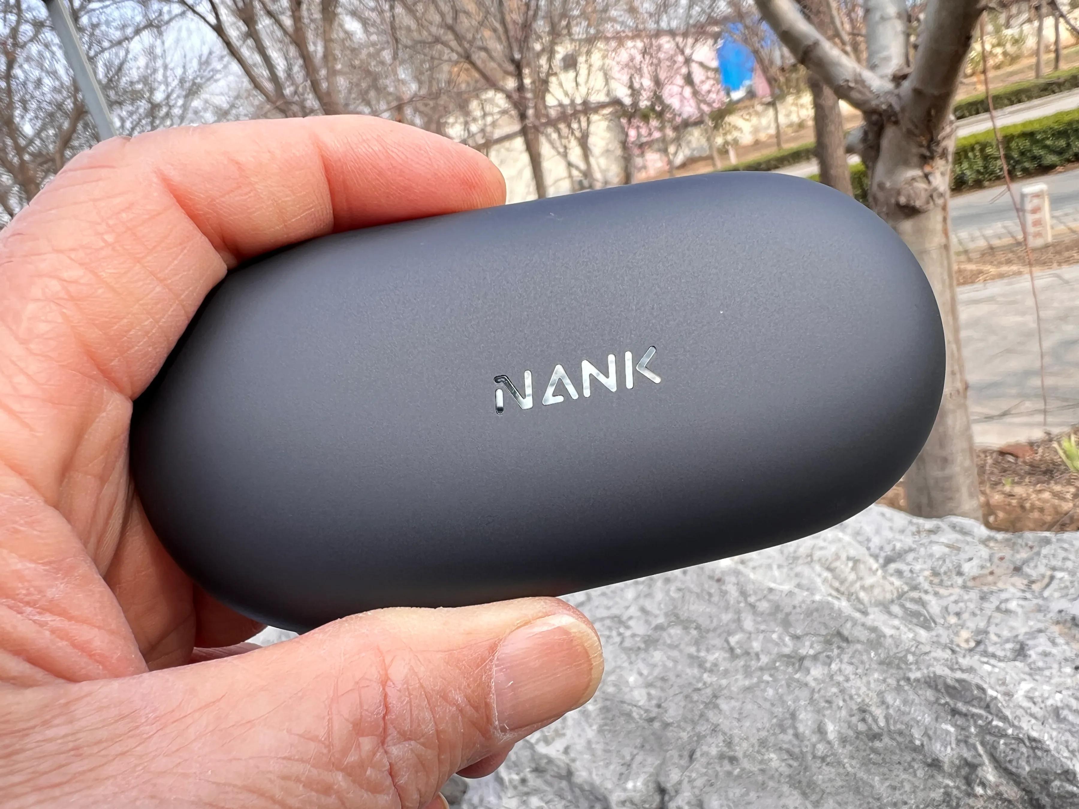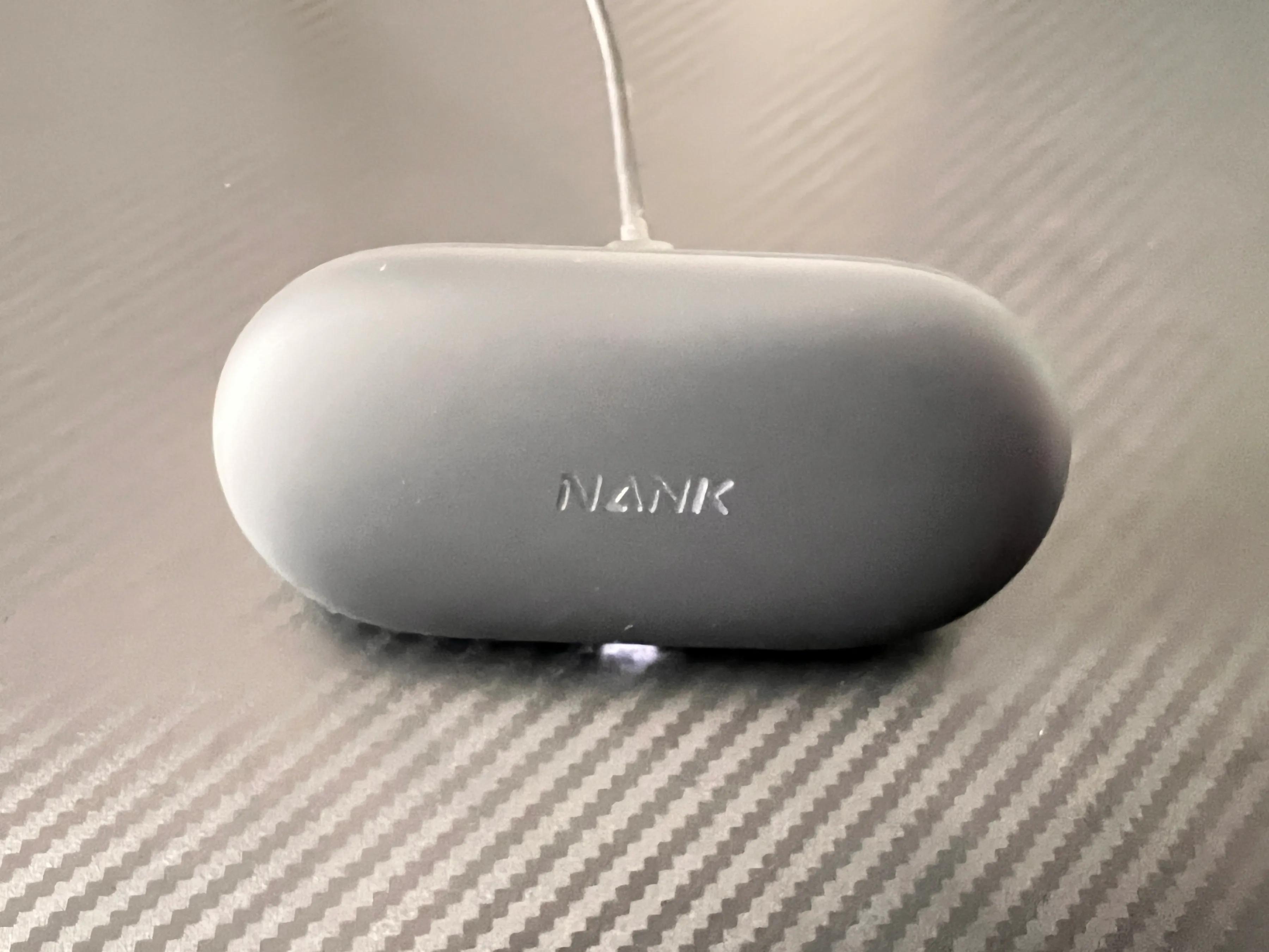 南卡OE Wing的充电仓采用磨砂质,手感舒适细腻,正面的金色NANK品牌LOGO很醒目。充电仓非常薄,厚度仅22mm,小巧玲珑,方便便携。TYPE-C的充电接口在背面,充电很方便。