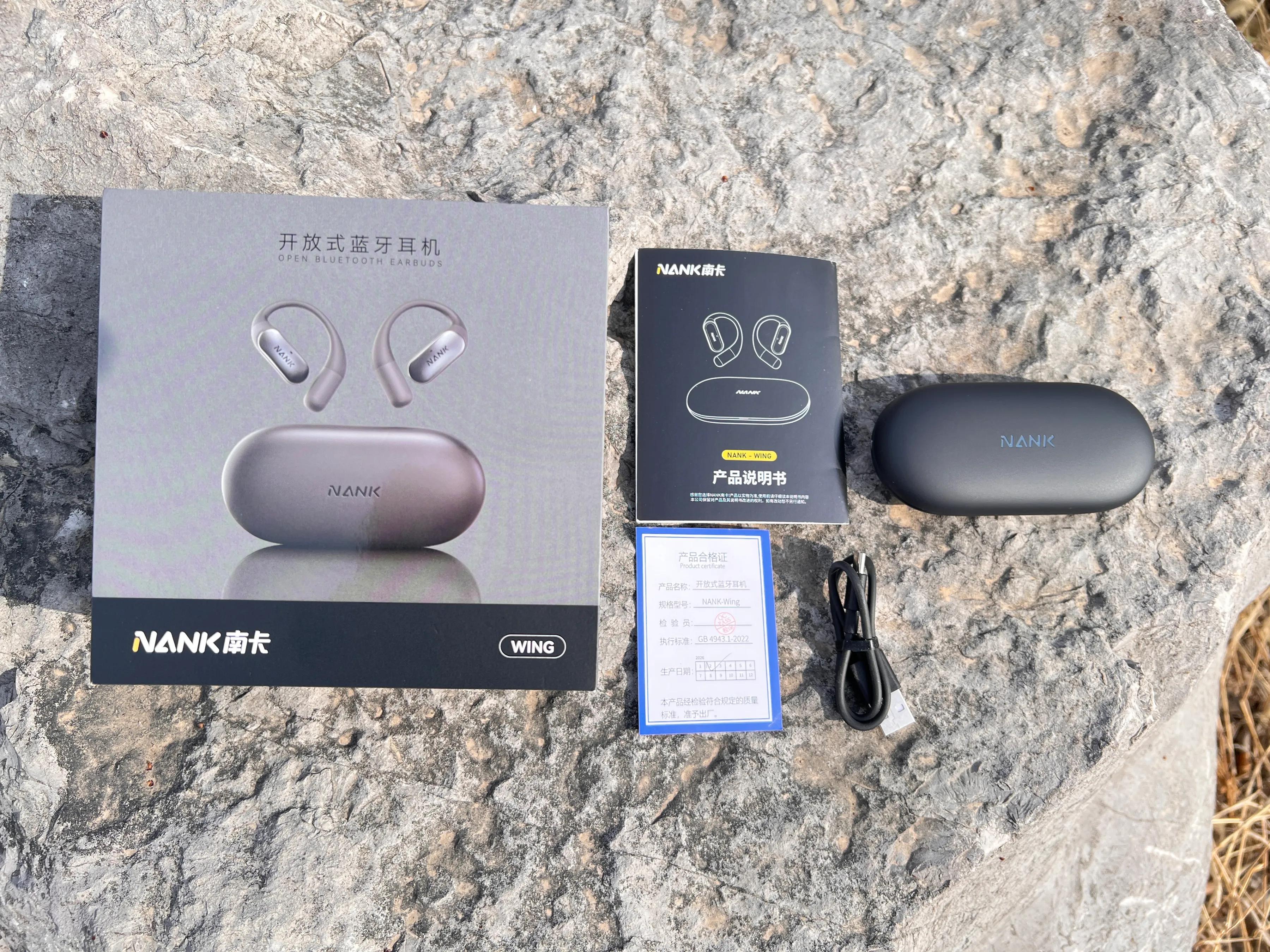 按照惯例我们先从包装说起。南卡OE Wing的外包装正面中心位置是产品渲染图,可清晰看到OE Wing型号,包装背后为产品信息。目前,南卡Wing有暮霭黑、暖沙金两款配色,我入手的是这款暮霭黑,在外包装上就可区分产品配色。打开包装,可以看到产品的全家福:合格证、产品说明书、TYPE-C充电线、充电仓(内含耳机)。虽然不多,但完全够用。