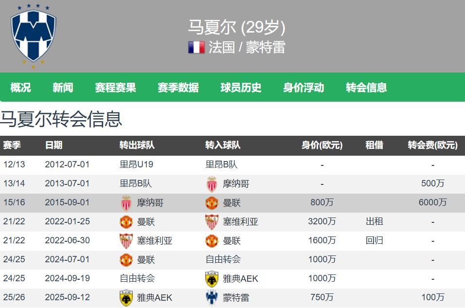 19岁的马夏尔就于2015年夏窗从摩纳哥以6000万欧元的转会费加盟曼联,当时马夏尔的身价仅有800万欧元,这说明曼联高层是多么看好马夏尔。这位法国前锋曼联首秀就斩杀利物浦,可以说加盟就是巅峰,2018年身价飙升至6500万欧元,超过了曼联签下马夏尔的转会费6000万欧元。但马夏尔虎头蛇尾,巅峰期很短,之后断崖式下滑,整个曼城生涯317场90球54助。离开曼联后加盟雅典AEK仅一个赛季就被扫地出门,如今在蒙特雷也是进球都难,大概率也待不久(2年合同,至2027年)。