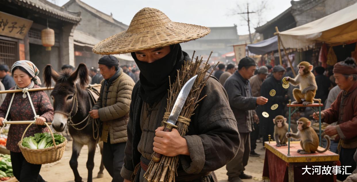 刘子龙扮作卖柴的,草帽压得极低,遮住半张脸。柴捆里藏着一把磨得发亮的匕首,刀锋在阴影中泛着幽光,如同蛰伏的毒蛇。