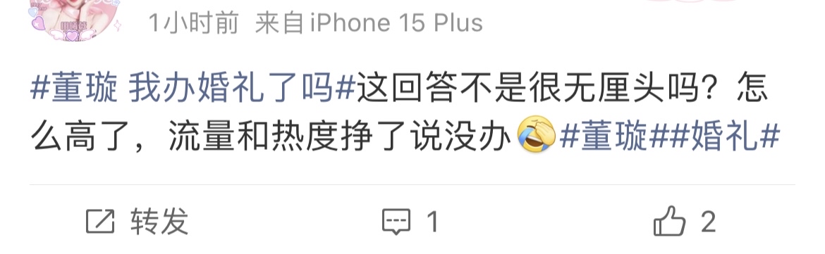 网友还以为她没有听清楚,又重复了一遍问题,董璇却笑着反问:我有办婚礼吗?