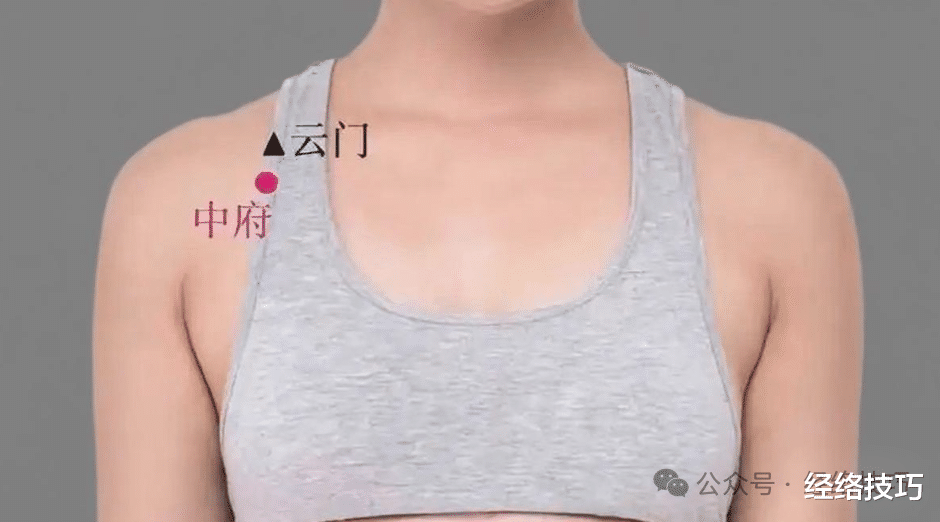 锁骨下窝凹陷处是云门穴,往下一个肋骨的位置就是中府穴,两者离肺最近,是肺气进出的门户。