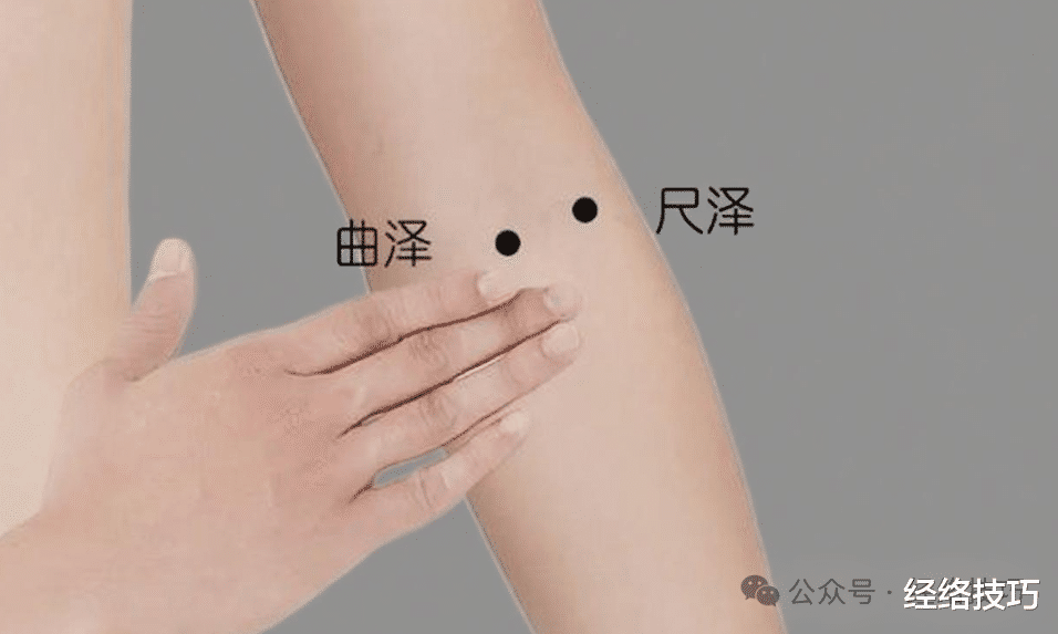 弯起肘关节,肘横纹上靠外侧大筋的凹陷处,就是尺泽穴,这里靠近关节,皮肤比较薄。