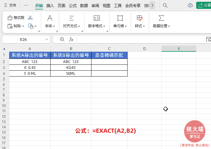 EXACT函数在处理特殊字符差异时的强大能力,这种差异肉眼很难发现,如下图所示检查从不同系统导出的产品编号是否一致。