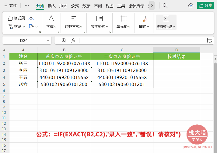 =IF(EXACT(B2,C2),"录入一致","错误!请核对")