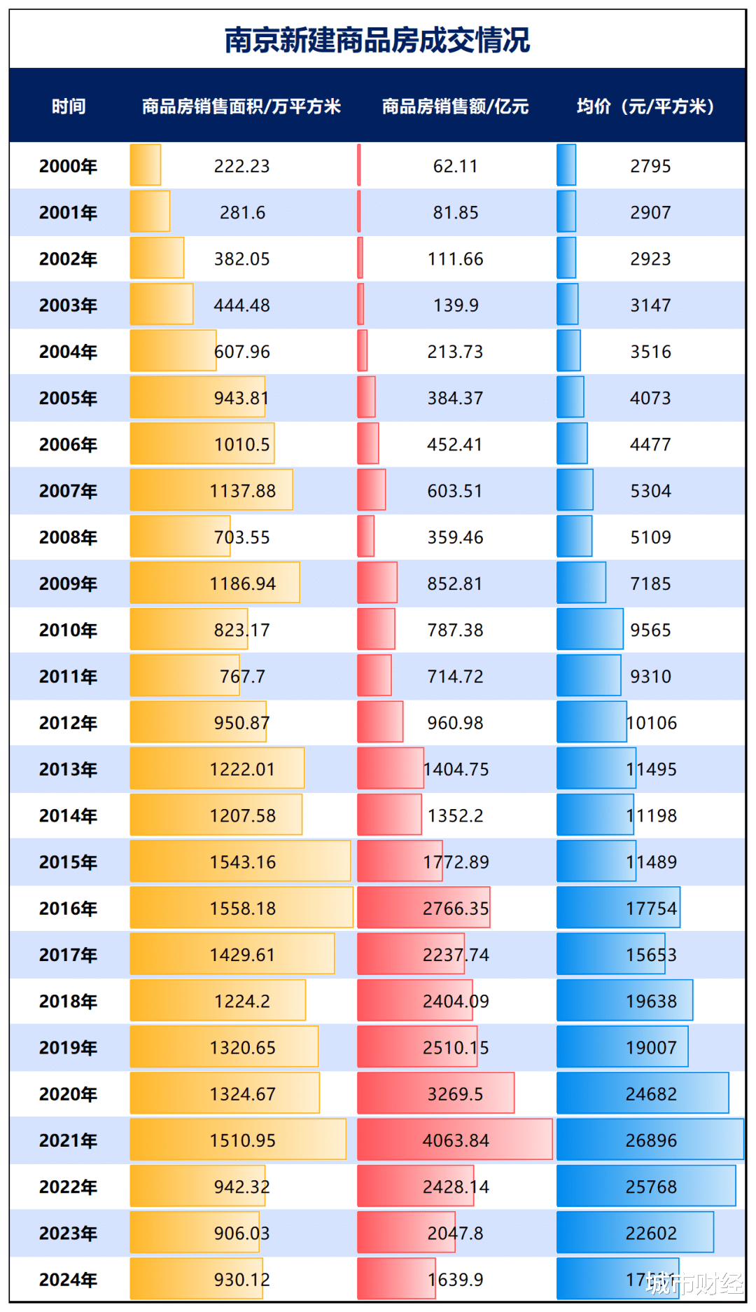 新房方面,从南京市统计局公布的数据来看,商品房成交面积与成交额均见顶于2021年,当年商品房成交面积1510.95万平方米,成交额4063.84亿元。