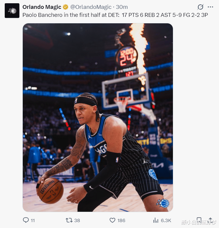 第三节的班凯罗表现依旧,在活塞打出一波10-0后是他站出来连拿6分帮助球队稳定局势,单节4中3拿到6分1篮板2助攻1抢断1盖帽,三节29分钟拿到23分8篮板4助攻,已经有魔术球迷开始盛赞班凯罗才是詹姆斯接班人了,PS的图是骑士巅峰詹。