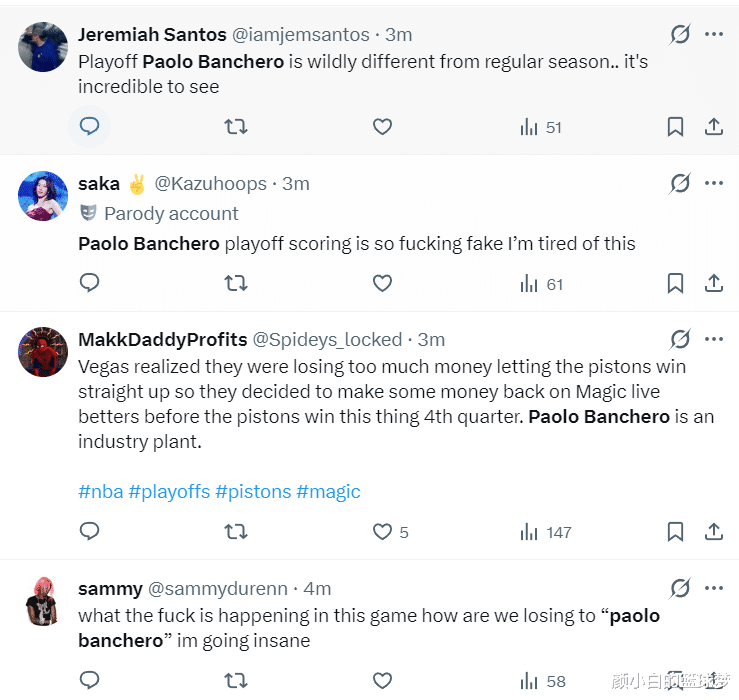 已经有球迷表示,班凯罗季后赛的表现跟他常规赛判若两人。更有活塞的球迷认为班凯罗季后赛的表现太假了,如果魔术爆冷赢球联盟应该审查班凯罗。(前三节小瓦格纳只拿到8分都没人讨论他)