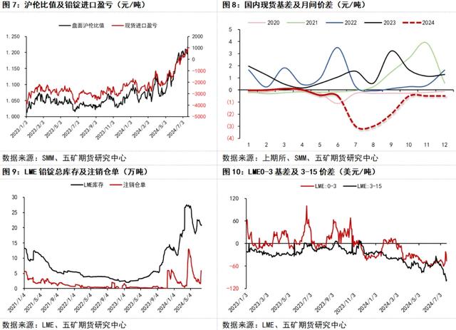 近端紧缺主要体现在下游“相对”旺盛的消费。2407合约交割量3.49万吨,相较于6月交割的2.22万吨及5月交割的2.54万吨,7月交割量显著提升,仓单量大幅下行至3.87万吨,达到24年春节后新低。虽然当前铅锭进口利润较高,进口窗口持续开启,但由于进口铅锭为非标品,进口商采取重熔渠道进行重熔、贴牌仍需一定时间,以当前持仓量与虚实比评估,2408合约空头交割压力仍然偏大。