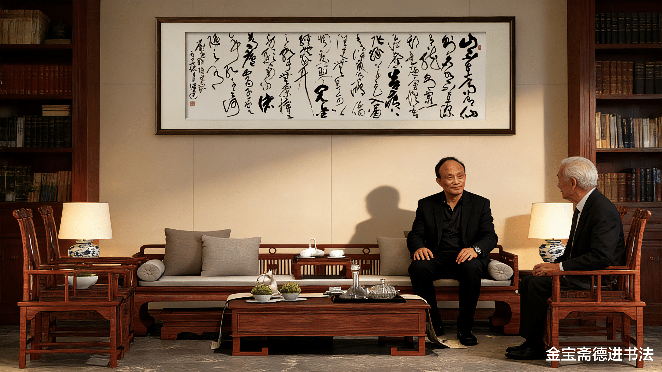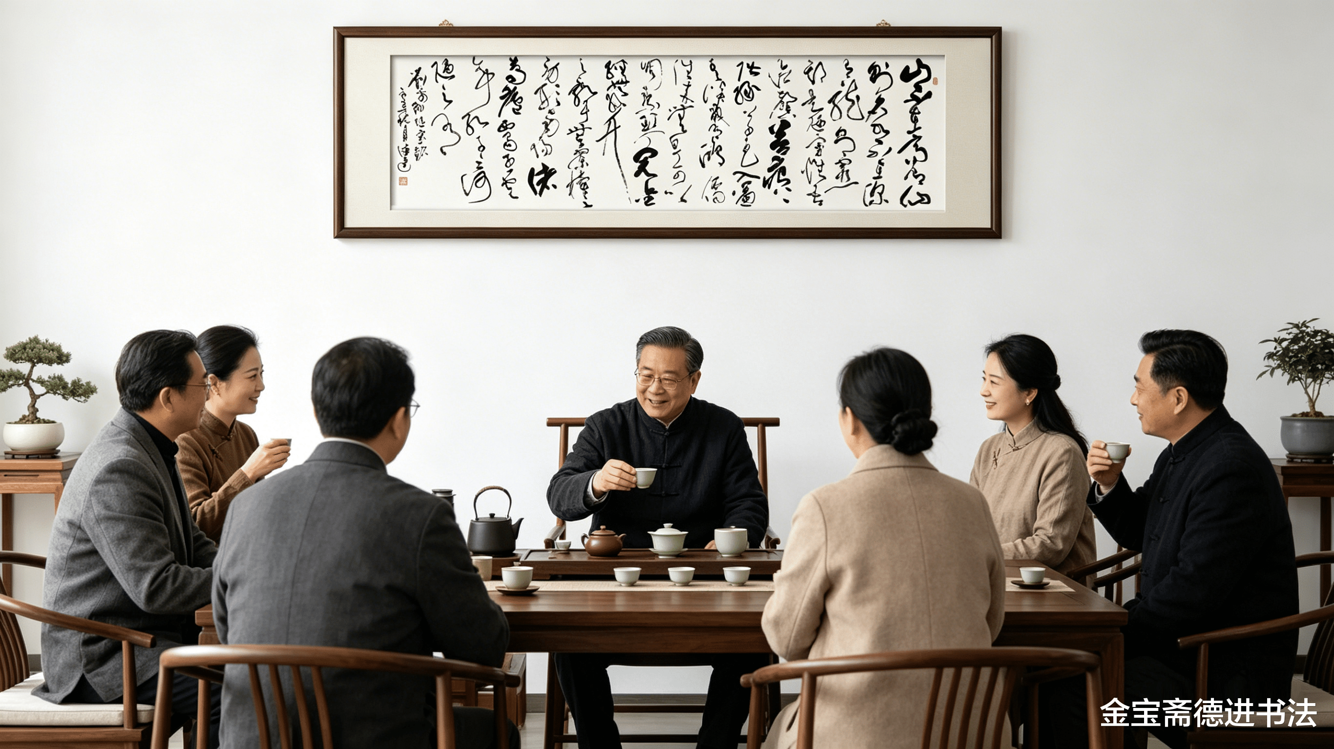 身后是草书挥洒的刘禹锡《陋室铭》,笔墨酣畅,气韵灵动,字里行间藏着淡泊从容的心境。没有喧嚣纷扰,无关名利往来,几人围坐闲谈,话语温和,心意相通,便是人间难得的惬意时光。