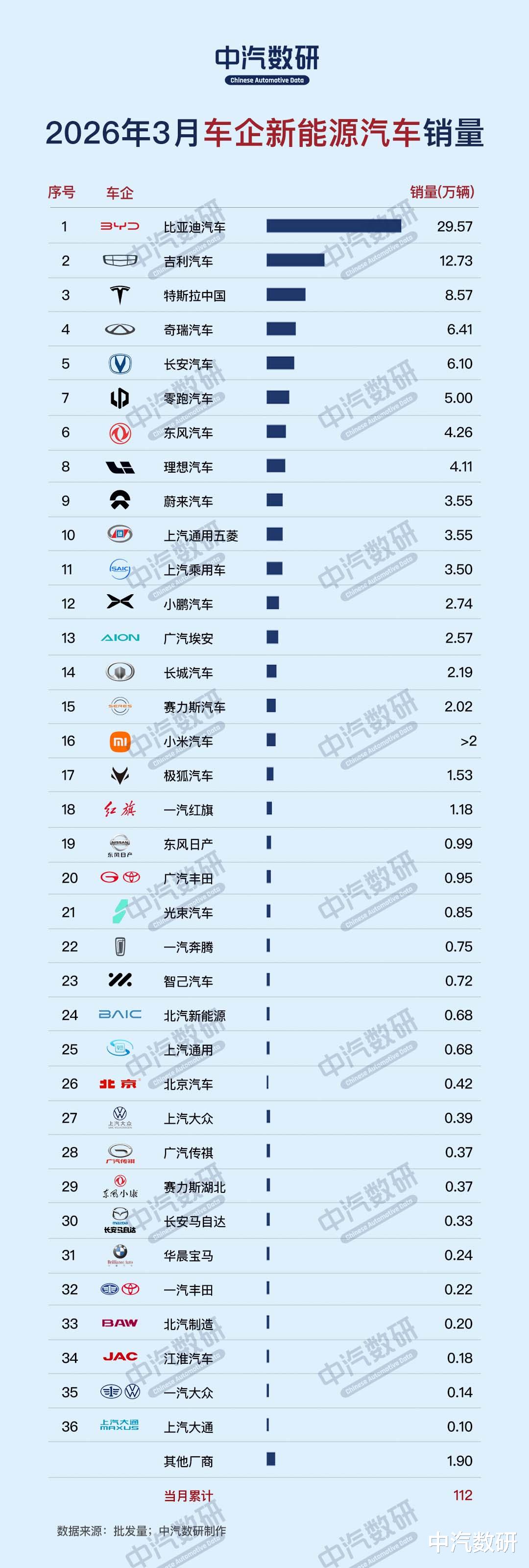 从具体车企批发销量来看,头部格局稳定,多家车企实现历史性突破,行业竞争活力持续释放。比亚迪以近30万辆的销量稳居榜首,龙头地位稳固。吉利、奇瑞、零跑、东风、理想、蔚来、上汽乘用车等超10家厂商,3月新能源批发销量均创下历年3月历史新高。