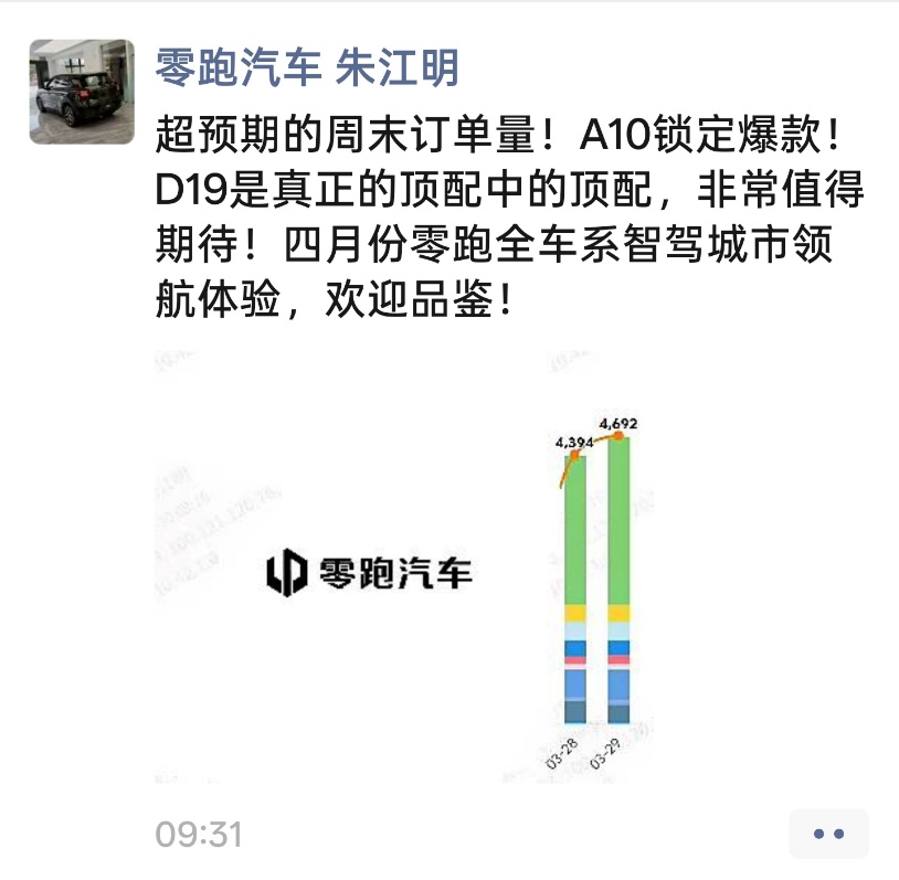 3月30日,零跑汽车创始人、董事长兼CEO朱江明在社交平台发出最新销量战报:超预期的周末订单量!A10锁定爆款!D19是真正顶配中的顶配,非常值得期待!四月份零跑全车系智驾城市领航体验,欢迎品鉴!